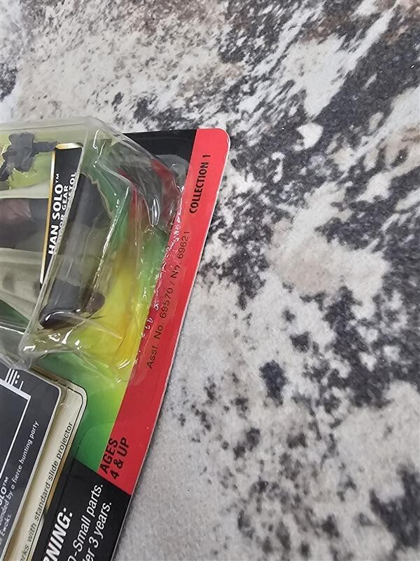 The product is a 1997 Star Wars Power of the Force Freeze Frame figure of Han Solo in his Endor gear, made by Hasbro. This collectible item is part of the franchise Star Wars and is based on the movie Return of the Jedi. The figure is from the Power of the Force series and is brand new, making it a sought-after piece for fans of science fiction and horror genres. The package has some shelf wear and a little crushing of the plastic on the left side. Never been taken out of