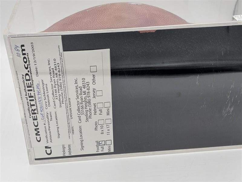 Show your support for the Detroit Lions with this authentic Cory Schlesinger #30 signed football. A must-have for any die-hard fan, this jersey is a tangible piece of sports memorabilia that celebrates one of the Lions' standout players. The signature comes verified with a Certificate of Authenticity from CMCertified.com, ensuring its legitimacy and adding value to your collection.